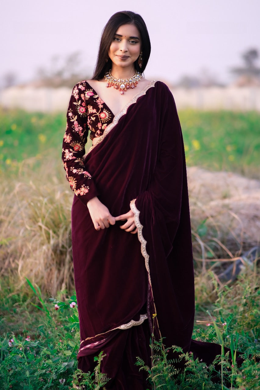 Wine Velvet Saree