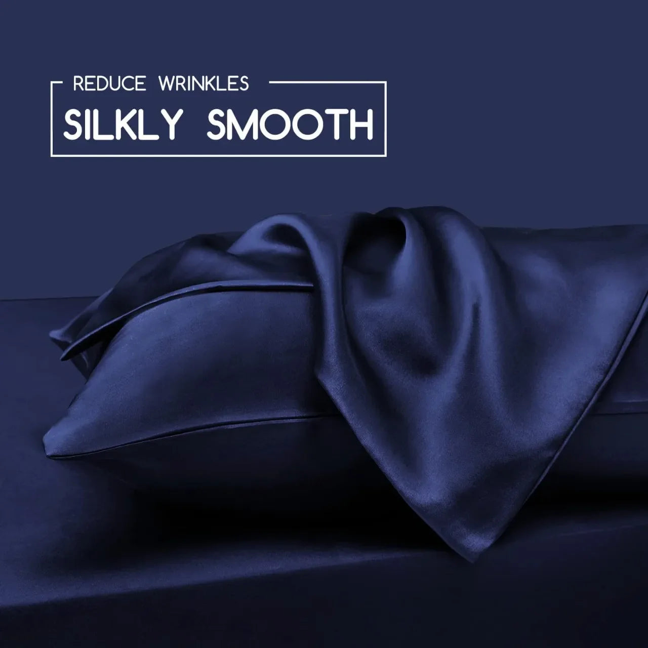 Navy Blue Satin Beauty PillowcaseAbout this item【Goodbye To Messy Morning Hair】With our satin pillowcases for hair and skin, you can rest easy knowing your hair will be soft & smooth upon waking in the morning. The silk satin pillow case allows your hair to remain frizz and tangle free and reduces hair breakage.【Enhance Your Beauty Sleep】Sleeping on our hypoallergenic non-irritating satin pillowcase can help your skin, too. With less friction tugging at your skin as you sleep, you will experience fewer sleep lines which can equal fewer wrinkles over time.【Zipper Free】No zipper closures poking you in the face as you sleep. MR&HM satin pillowcases are made without a zipper closure, instead using an envelope closure design. The silky pillowcase holds your pillow securely in place while you rest.【Comfortable Sleep】Satin fabric is an excellent option for comfortable sleep. The silky fibers are great for temperature regulation. This keeps our satin pillowcase cooler while you are sleeping, allowing you to get a good night’s rest.【Affordable Luxury】Compared with silk pillowcase, satin fabric is more durable. MR&HM satin pillow cases are high quality and extravagant, which are luxury at an affordable price.