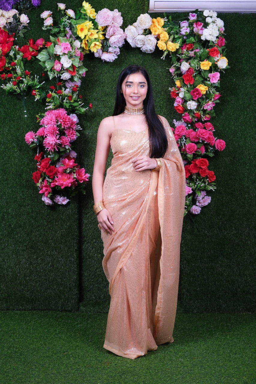 Gold Filmfare Sequence Saree With Unstitched Blouse Material ❤️Easy To Wear ❤️No Petticoat Required ❤️Made of Sequence Crepe ❤️Pre Stitched Pleats ❤️Can be customised from Xxs to XXXL Feel the blossom of serenity and colours and get ready to flaunt your Indian style in a new and amazing way.
