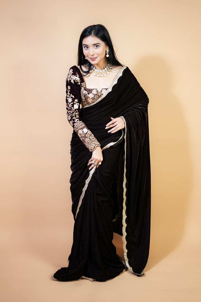 Chocolate Brown Velvet Saree