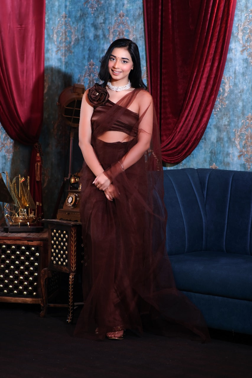 Unstitched Brown Mesh Saree