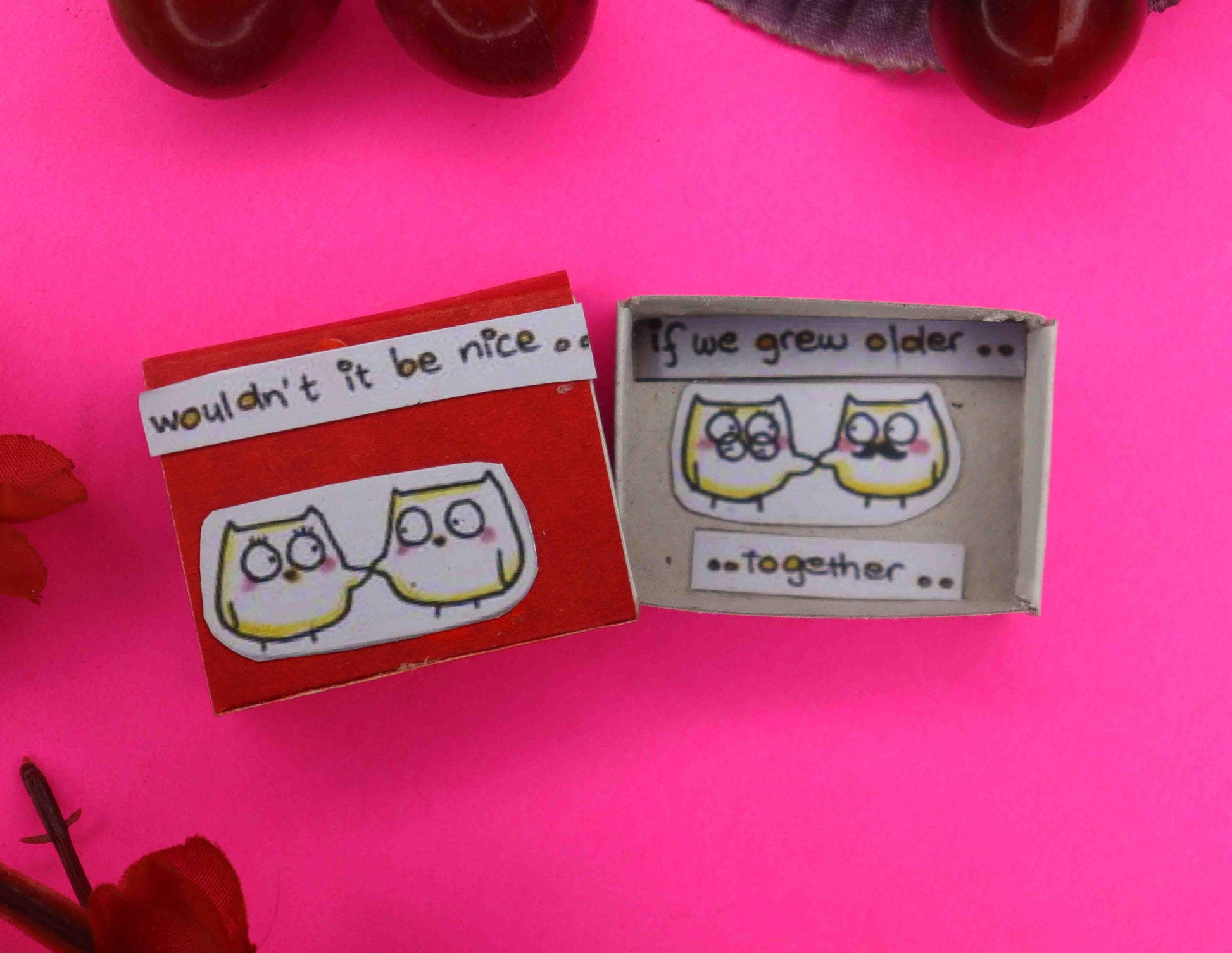 Each matchbox card starts with a sweet message on the outside and once opened, reveal the surprise message inside.The boxes measure 6 cm by 4.5 cm by 1.5 cm each and come in a variety of colors.The matchbox cards are handmade with care and packaged to ensure they reach you safely.